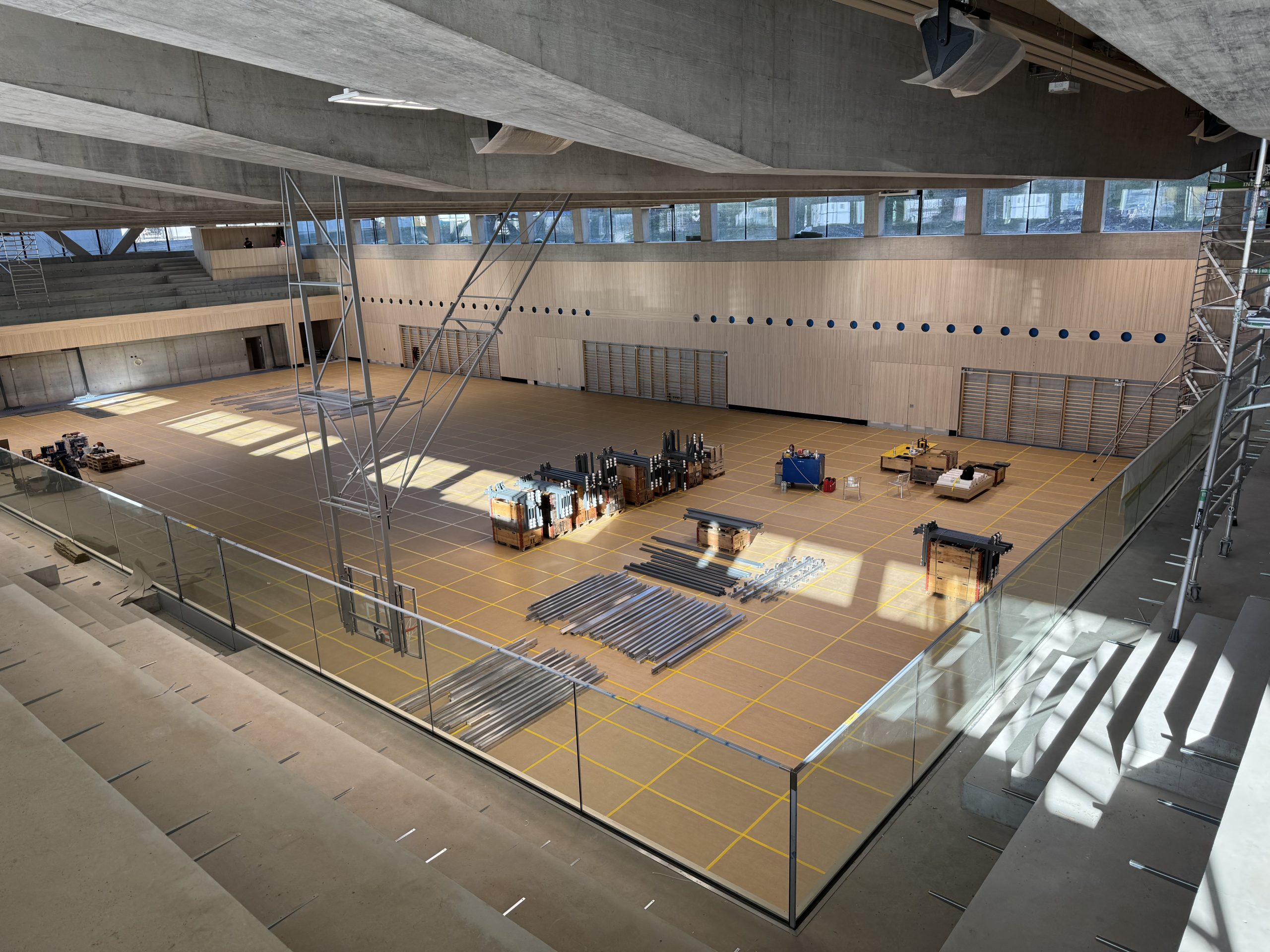 Aktuell steht die Inbetriebnahme der Haustechnik und Lüftungsanlagen an. Die beeindruckenden Dimensionen der Lüftungsanlage für die Sporthalle verdeutlichen die Grösse des Projekts. Parallel dazu wurde die gesamte Wärmeversorgung über ein Anergienetz in Betrieb genommen. Zwei Grundwasserwärmepumpen und zwei Gasbrenner für den Notnetzbetrieb bilden das Herzstück der Energiezentrale, die zusätzlich das gesamte Quartier mit Fernwärme versorgt. Dieser Zusatzauftrag wurde von ETAVIS im Auftrag des Energieversorgers IBC erfolgreich umgesetzt.